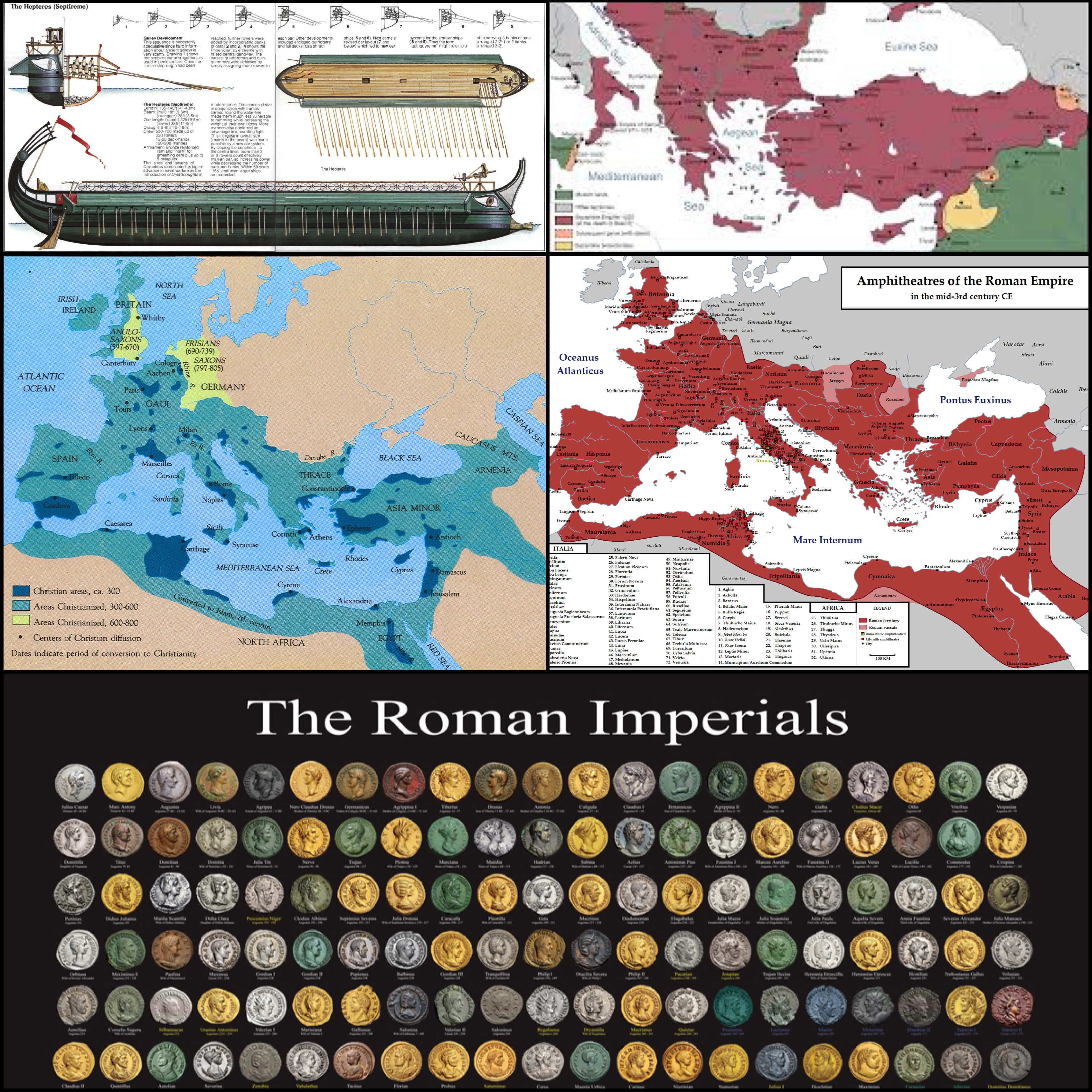 13. These images shown above show elements of territorial and cultural dominance of two of the first great empires/cultures, the Greeks and Romans. The image in the top left is of a military technology that was created and improved by the Greeks to dominate the seas of the ancient world, the trireme. The trireme allowed for further travel by sea, faster travel time, and most importantly, more effective turning ability. All of these attributes of the trireme allowed for the Greeks to build an empire and colonies all along the Mediterranean Sea. Great Greek colonies such as the Phoenician and Mycenaeans could not have be able to flourish without the help of their possession of superior naval technology. This possession of military technology is similar with the utilization of the legion in the Roman army. The rank and structure of the legion allowed for Romans to be better prepared and control vast amounts of territory held be far less sophisticated “barbarian tribes”. The conquering of these peoples allowed for the construction of intercontinental empire that would have a lasting impact on future civilizations to come. The bottom image of the blog post shows all of the Roman Emperors, and the fact that there are so many men shown is a testament to the longevity of the empire’s power.